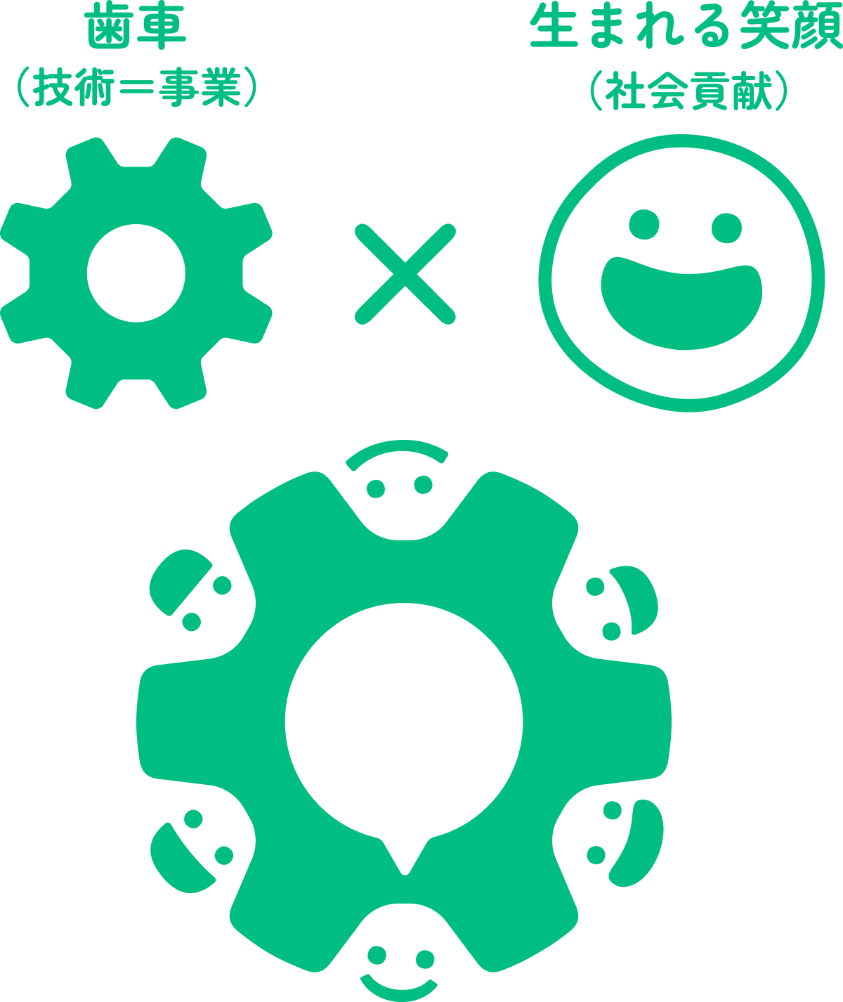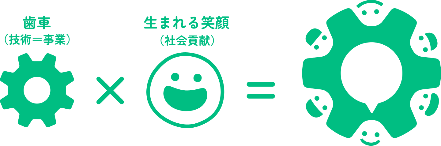 私たちは、この想いを「みんなと創る みんなで生きる社会」というスローガンに込めました。社会共生活動のロゴは、当社の技術(=事業)とそこから生まれる笑顔(=社会貢献)を表しています。