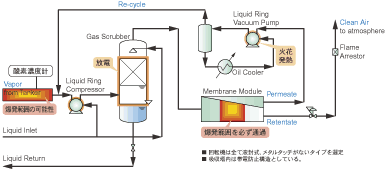 膜分離法によって処理されるベーパーは、濃縮された高濃度の循環ベーパーと入り口で合流するため、燃焼上限界以上の高濃度になり、安全になります。 また、VOCを分離除去した処理済ベーパーは燃焼下限界以下になり、安全になります。 さらに、VOCを分離除去する際には、濃度が低下していく過程で燃焼範囲内を必ず通過しますが、これは膜モジュール内のため着火源がなく安全です。 燃焼範囲の広く、プロセスでのVOC濃度制御では安全確保ができない場合には、イナートガス添加による酸素濃度制御を採用して、安全確保を実現させます。