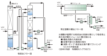 膜分離法VRUプロセスでは、従来の吸収法によるプロセスで循環使用していた吸収液の働きを薄膜に置き換え、大幅な性能向上・省エネ・コストダウンを実現しました。