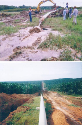 本プロジェクトでは、マラッカのペトロナス製油所(MRPP)とポートディクソンのシェル製油所(PDPP)を発基地に、クアラルンプール国際空港(KLIA)とクランバレーの石油集配基地(KVDT)を着基地とするマルチプロダクトパイプライン(全長約130km×16)を建設し、KLIAとKVDTへのパイプライン分岐点には分岐基地を設けて、着基地の切り替えを行えるように設計・施工しました。