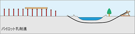 パイロット管の先にはドリルヘッドが装着され、泥水のジェット噴射により土を掘削します。パイロット管は削進機(リグ)により送りだされます。削進中のドリルヘッド位置は二系統の位置センサーによって監視し、リグによって方向を制御し、計画路線通りに削進します。