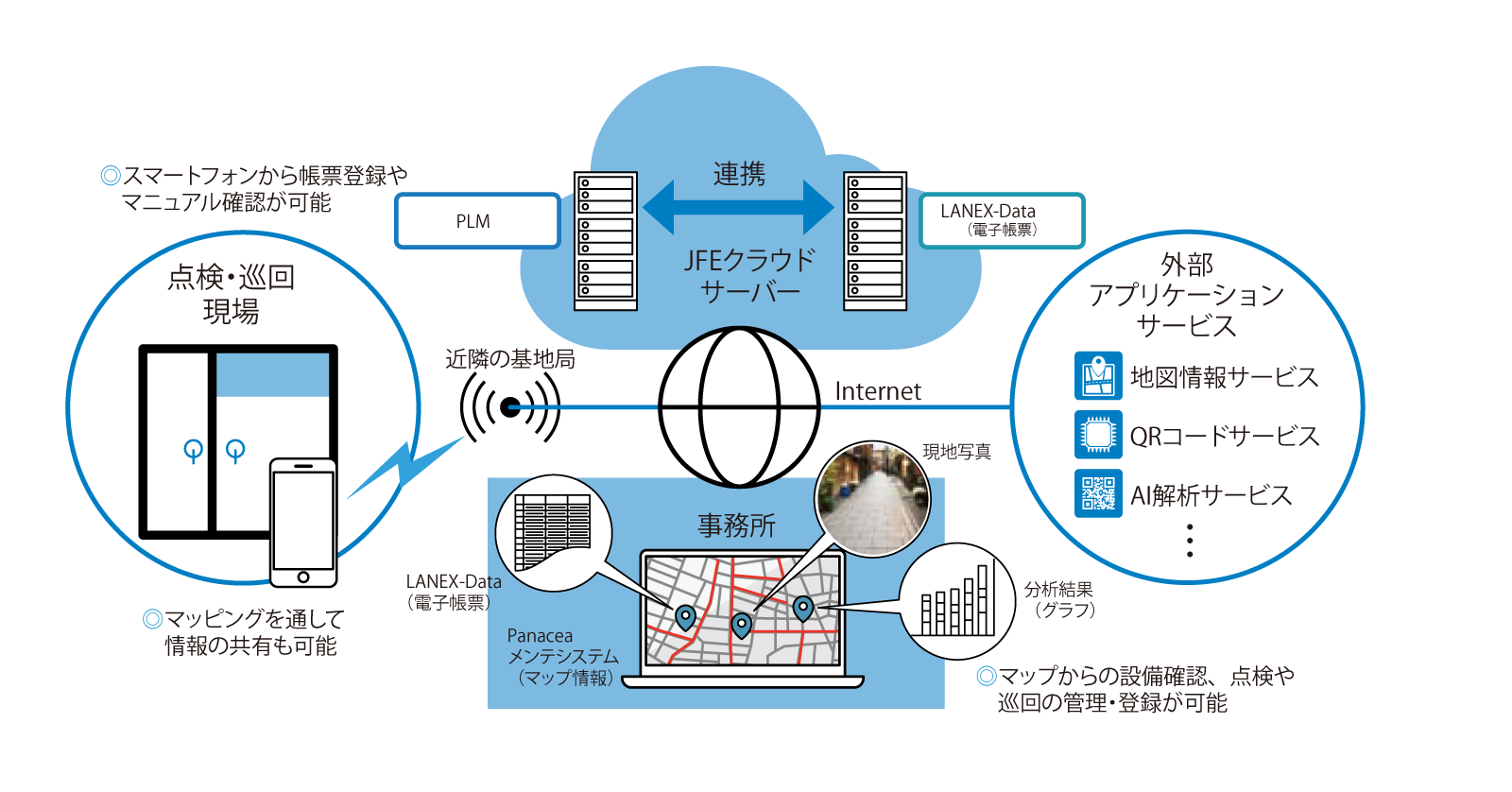 パナシーアは、マップ画面でデータを一元管理できる「PLM」、保守データをデジタル管理する保守点検電子帳票「LANEX-Data」を組み合わせ、管路や施設の保守点検の高効率化をサポートします。